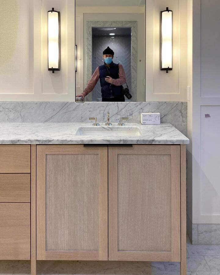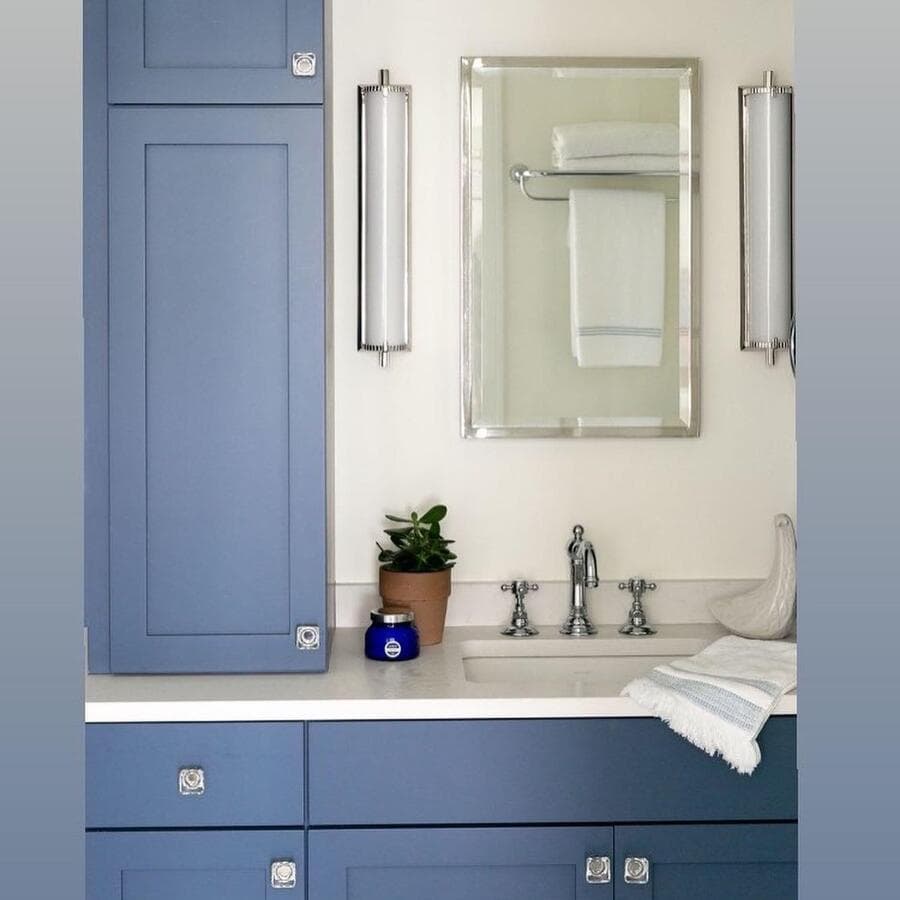 Чтобы равномерно осветить зеркало в ванной с любой стороны, мы рекомендуем установить бра чуть выше уровня глаз или примерно на 1,5 м от пола до центра задней панели бра.
