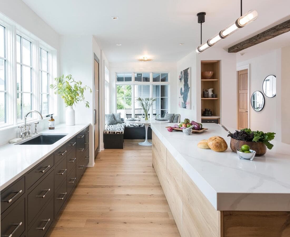 Ключ к определению размера удлиненного светильника - это пропорции. Мы рекомендуем выбирать светильник размером не более 2/3 длины стола или острова. Подумайте о том, чтобы повесить пару линейных светильников для освещения очень длинных поверхностей.